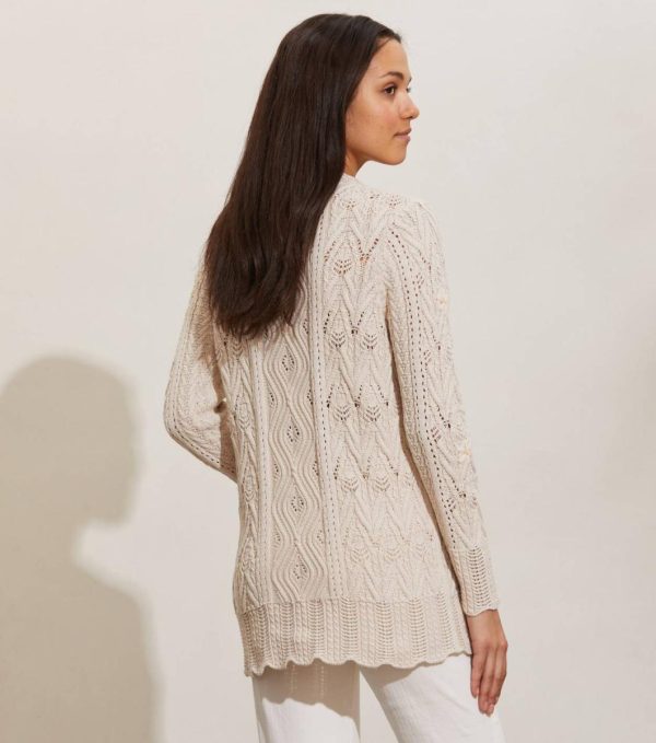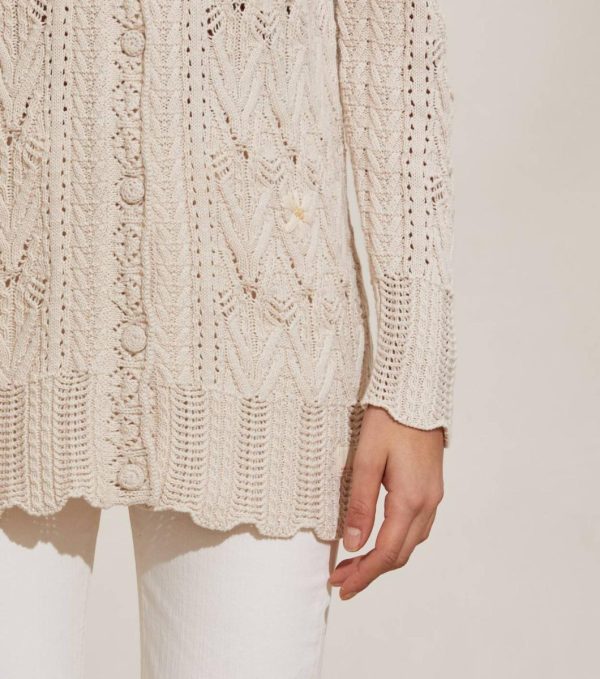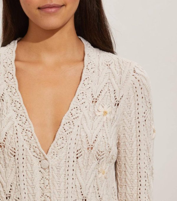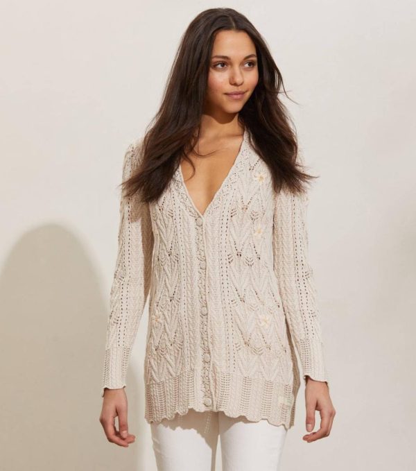 Odd Molly Nova Cardigan är en kabel-/pointellestickad kofta med handbroderade blommor. Den har knappar framtill.